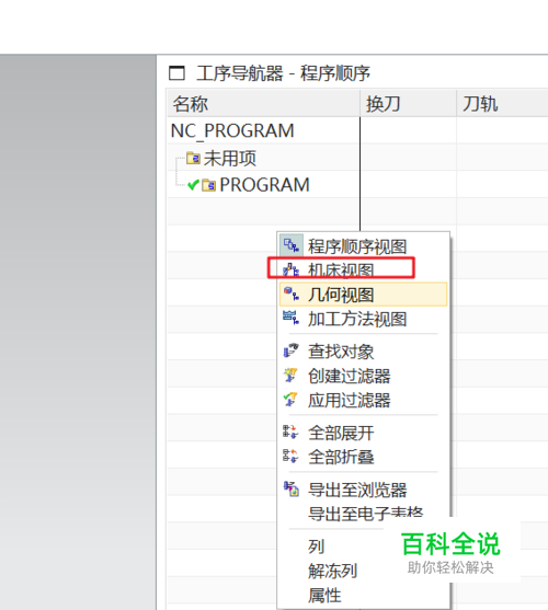 打开UG10.0进入加工模式;在工序导航器的空白列表中鼠标右键,选择机床视图。在机床视图中,可进行刀具的创建。
