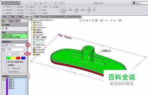 点击“分型线”,选择Top Plane,设定拔模角度,然后选择“拔模分析”,系统将自动分析分型线。