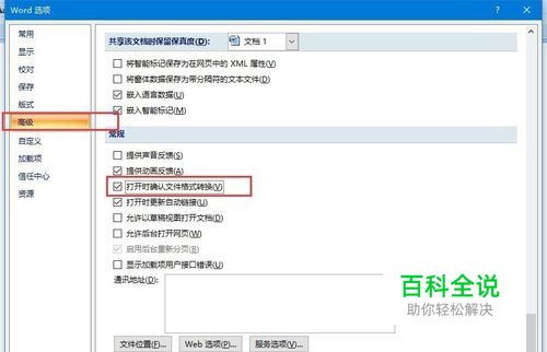 2、从任意文件中恢复文本 第二种方法是使用“从任意文件中恢复文本”的功能,这个方法可以在任何格式的文本中提取文字。 (1)、首先,点击菜单栏,“word选项-高级”,把“打开时确认文件格式转换”这一项打勾,之后点击确定。