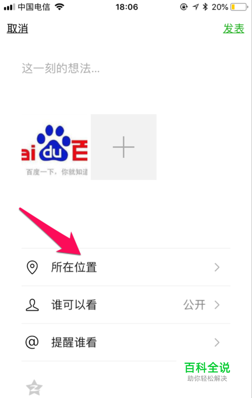 进入微信发布朋友圈里在发表前点击“所在位置”如图: