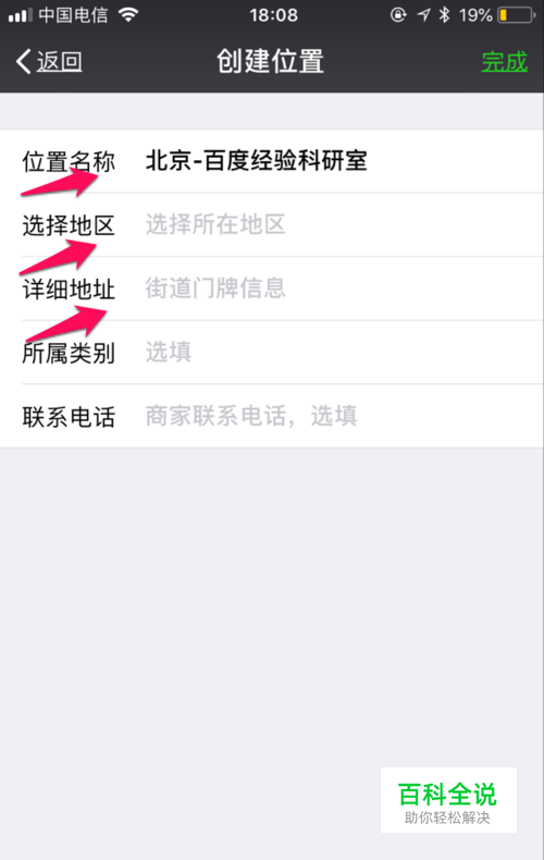 进入创建位置界面,选择地区跟详细地址这个是必须填的,下面的类别及电话根据自己所需可填与不填,弄好信息后点击完成。