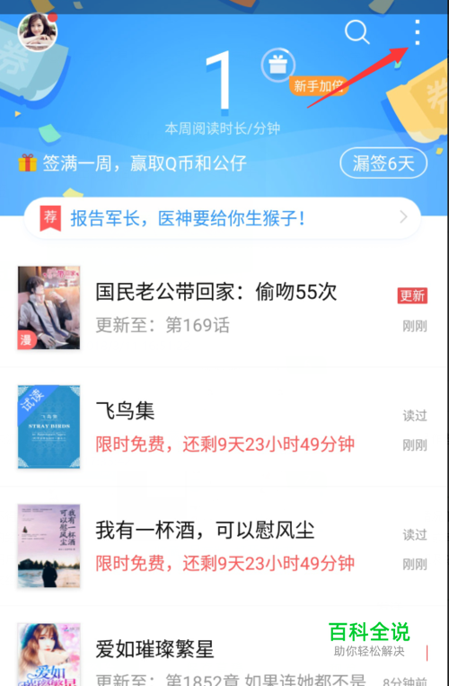 首先我们先打开qq阅读,打开之后会进入到“书架”面板,此时我们单击该面板右上角的三点图标,如图所示。