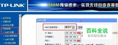 接下来我们点击 【网络参数】- 【WAN口设置】 wan口连接类型 改为 静态IP IP地址 填写单位局域网 100段的IP(最好跟单位网络管理员要一个固定IP) 子网掩码 网关 DNS 跟 100段的 一样。 保存!