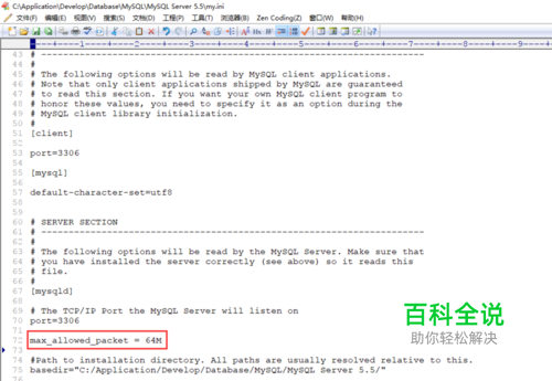 打开MySQL安装目录下的my.ini文件,添加max_allowed_packet,设置大小为64M,如下: