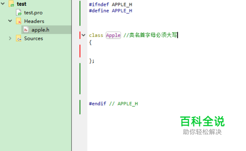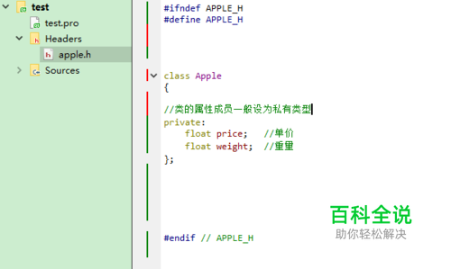 首先,我们需要先写好类的定义,类的定义一般放在头文件中。 在此需要注意的是,类名的首字母必须要大写。比如示例中的这个苹果类,其第一个字母必须是大写的 A,而不能是小写 a。