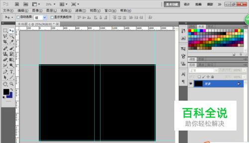新建一个406毫米*266毫米的白色背景,填充黑色,选择视图,新建参考线,设置水平参考线为3毫米,193毫米,213毫米,403毫米,设置垂直参考线为3毫米,263毫米,点击确定。