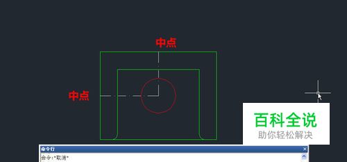 在上面提供的经验引用中已经有详细的操作步骤,这里就简单的讲一下。 输入C回车,执行画圆的命令,输入.x,捕捉顶部直线的中点,如下图所示。