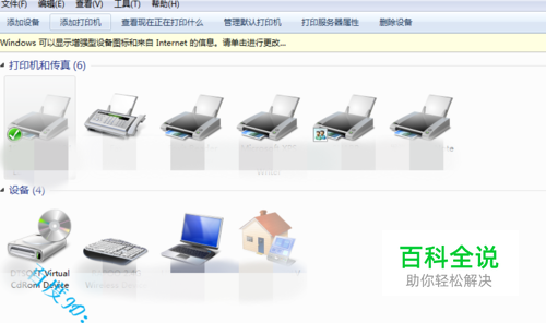 在设备和打印机界面中,可以看到目前已经添加了那些打印机,对于要新增加打印机,点击顶部菜单栏--添加打印机。