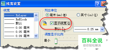 在“线宽设置”窗口中,可以勾选“显示线宽”这样就可以清楚看到所有对象的线宽。