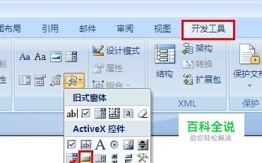 打开Word2007,点击“开发工具”选项卡中的“AcitveX控件”中的“命令按钮”。