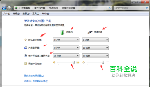 就会看到电池和接通电源的选项。分别选择不同状态调整屏幕亮度。最后记得点击保存修改。