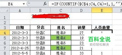 在表格的右侧增加一个辅助列,并设置一个列标题,如“人员数量”,在E4单元格中输入公式: =IF(COUNTIF($C$4:C4,C4)=1,1,"") 然后填充公式到最后一行。