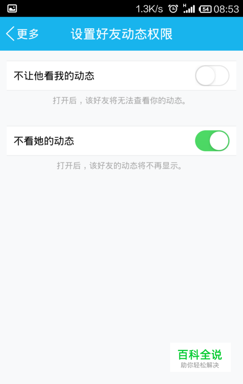 在动态权限设置中我们就可以看见有两个选项。第一个不让他看我动态,第二个不看他的动态。