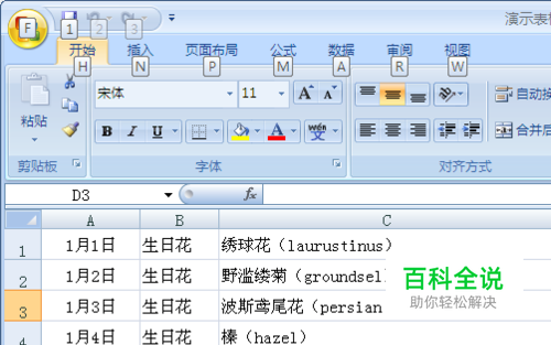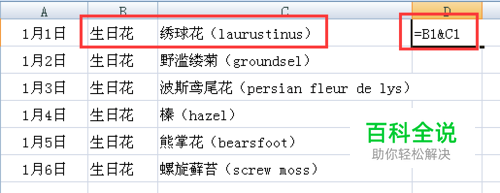 这样,所有的内容都合并在一起了。 我们发现,在生日花与后面花的名字中间没有空格,这样很不美观。我们也可以在它们中间添加一些符号,把它们给间隔开。