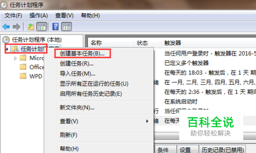 在 任务计划程序窗口的左侧菜单列表中可以看到有一个“ 任务计划程序库”,在这个程序库上点击右键选择“ 创建基本任务“,基本任务就可以满足我们的定时功能需求。