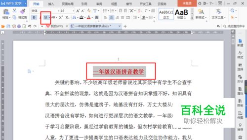用光标把划线的文字选中,看一下,“开始”下划线的U,是不是变暗了,如果变暗了,说明是我们标记的下划线,只要点一下U就可以了。这样就可以轻松的删除了下划线。