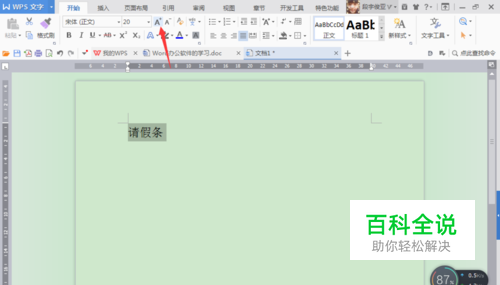 打开Word软件,鼠标单击一下,文字光标符会自动出现,输入请假条。在工具栏的上方有一个A字符图标,这个图标表示文字可以自动放大增加,加大字号凸显文字的标题。