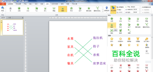 第六步:单击第一条连线,单击“动画”选项卡,在“高级动画”组中单击“触发”按钮,接着选择“单击”、左边第一个题目文字的名称,比如这里“水果”对应的是“textbox3”。其他几个连线按同样的方法设置即可。这样,放映PPT时单击哪个题目出来哪个连线。