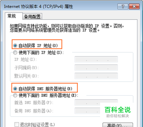 选择“ 自动获得 IP 地址”和“ 自动获得 DNS 服务器地址”,单击“ 确定”。