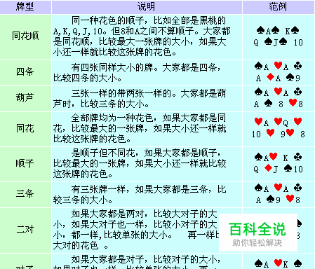 牌型比较:同花顺>四条>葫芦>同花>顺子>三条>二对>对子>散牌。