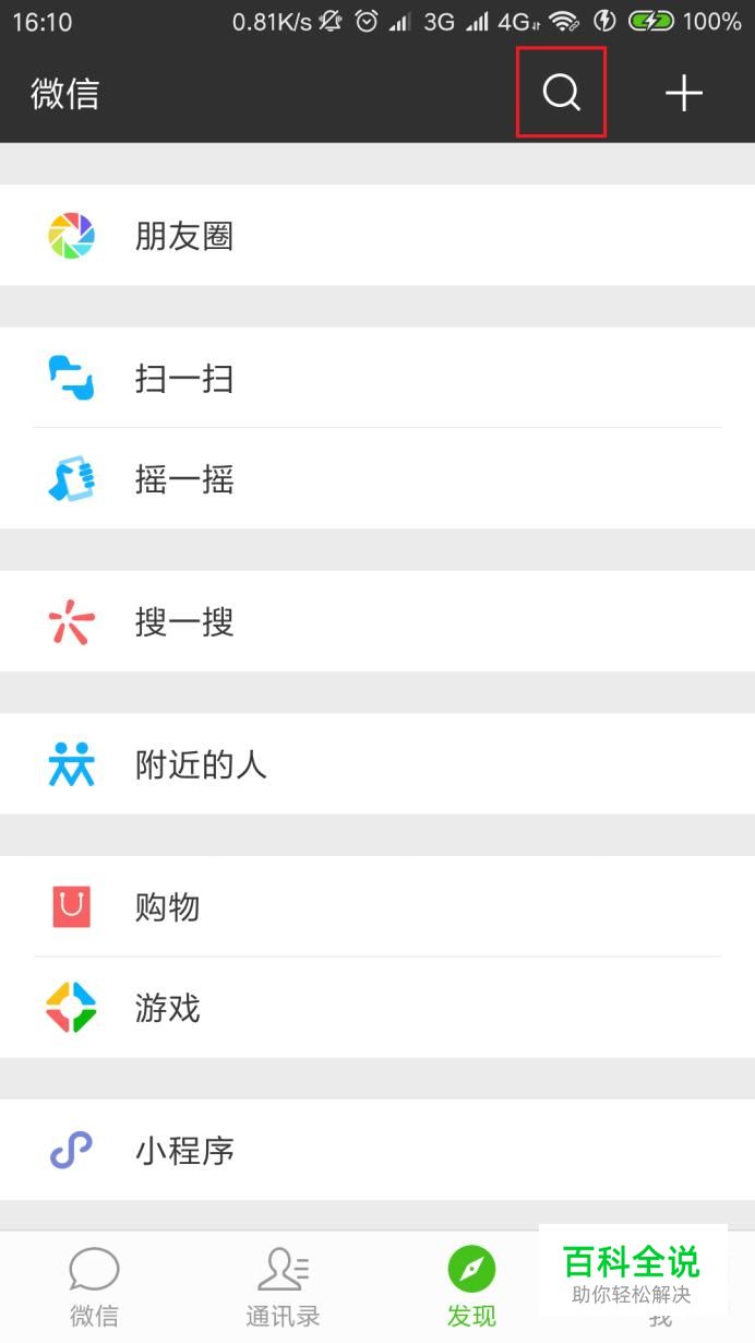 以微信应用APP为例,打开微信应用APP主页面,点击页面顶部“搜索”菜单按钮,进入搜索页面。