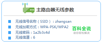 第一步,确认主路由器的无线信号名称、无线密码以及无线信道,本文使用以下参数举例: 注意:无线桥接(WDS)的主要操作均在副路由器完成,只需固定主路由器的无线信道。