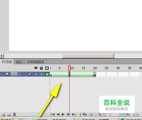 这时,我们看时间轴这里,第1帧到第20帧之间呈绿色状态,而且中间有一条向右的箭头。这表示,创建形状补间动画成功啦。 按下播放按钮,可以看到圆形从左到右移动。