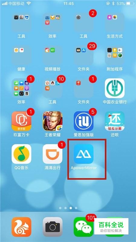 首先在我们的手机桌面上找到ApowerMirror并点击它,如下图所示。