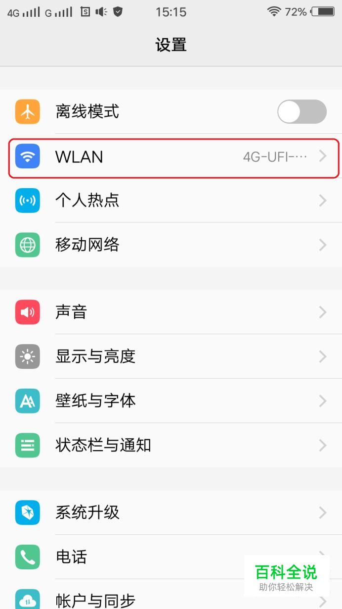 首先,打开手机设置,点击“WLAN”,找到当前手机连接的WIFI名称,点击一下右侧图标。