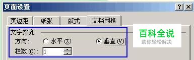 上图中,切换到“文档网格”,然后,找到“文字排列,里面有“水平”、“垂直”两种方向。如上图,选择的是“垂直”方向,得到的结果如下图。