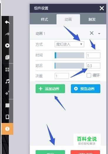 第四步,设置动画效果。还是以文字为例来讲一下,组件里面切换到动画这一项,然后选中要编辑的某行或者段落,选择动画方式、间隔时间和延迟。可以同时添加多个动画,把时间错开显得有节奏感,也可以点X删掉某个动画效果,添加完点确定。