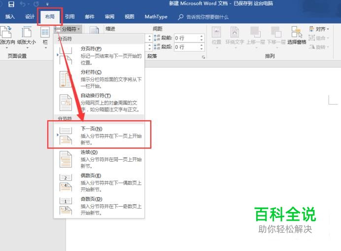 点击“布局”--“分页符”--“下一页”。如图,变为两个段落(两页)。