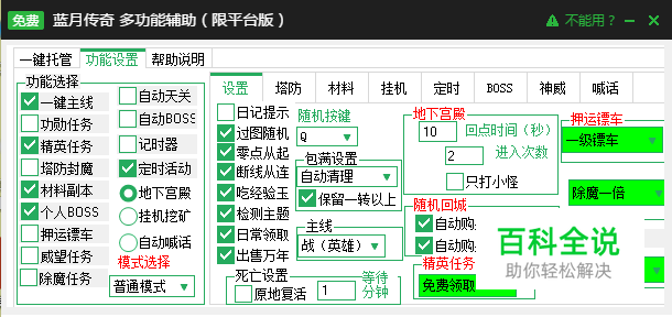 软件介绍: 新浪蓝月传奇辅助工具,是由新浪页游助手专门针对蓝月传奇页游版研发的高级辅助工具。本辅助可独立使用,绿色,安全无毒,设置轻松便捷。可自动完成蓝月传奇页游任务,一键升级功能体验解放双手轻松游戏。内置极速稳定的浏览器内核,让你的页游之路更加高效便捷,支持所有游戏无限小号多开、加速等。 辅助功能: 1、基本设置:日记提示、过图随机、断线重连、吃经验玉、包满处理。 2、基本功能:一键主线、功勋任务、双倍领取、地下宫殿、随机回城、押运镖车、除魔任务、自动挂机、小号引怪、自动挖矿、VIP矿洞、自动天关、记时器、地下宫殿。3、塔防封魔:电守卫、毒守卫、冰守卫、爆守卫。 4、定时任务:金猪送礼、膜拜城主、多倍押送、海天盛宴、帮派守护、夜战比奇、邀请闭关、世界BOSS、锁妖塔、石墓迷阵、神威魔狱。5、材料副本:强化副本、神羽副本、真气副本、神盾副本、龙魂副本、魂石副本。 6、个人BOSS:玛法邪灵、霜岭巨人、灭世魔君、极地猛犸、远古兽王、阿修罗神。7、野外BOSS: 僵尸王、沃玛教主、触龙邪神、野猪王、祖玛教主、牛魔王、赤月恶魔、海魔护法、海魔祭司、战舰龙王、蚂蚁祭司、蚂蚁将军、蚁后、金爪赤狐、红耳素狐、九尾狐、魔龙教主、火龙王、冰霜教主。 8、BOSS之家:僵尸王、沃玛教主、触龙邪神、野猪王、祖玛教主、牛魔王、赤月恶魔、蚂蚁祭司、蚂蚁将军、蚁后、九尾狐、魔龙教主、火龙王、冰霜教主、雷炎教主。9、玛雅BOSS: 黄泉教主、蛮人王、海魔护法、海魔祭司、战舰龙王、金爪赤狐、红耳素狐、九尾狐。 10、自动神威刷牌子:支持1-7层以及坐标自定义。