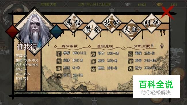 任我行的属性非常高,拳掌熟练度更是高达180点,剑法熟练度也有110之多,不过刀法熟练度只有0点,奇门也不高,70点,所以我们的任我肯定要靠拳法输出了。任我行最初带的武功日月神掌和须弥山掌都不用洗掉,留着就可以。