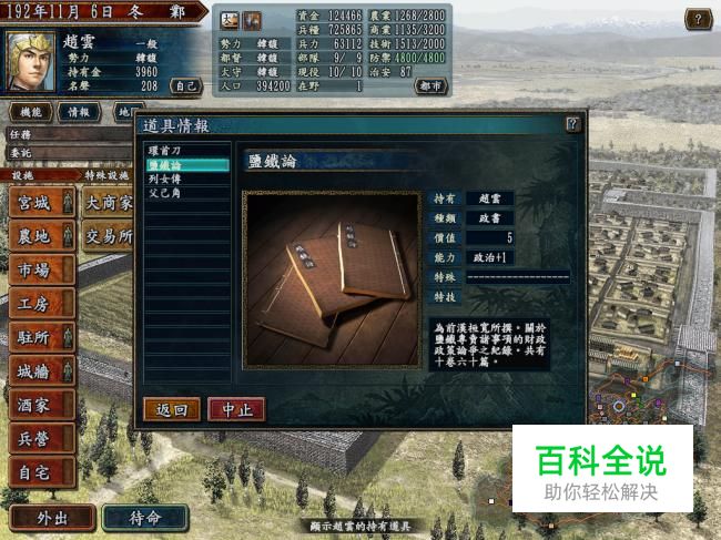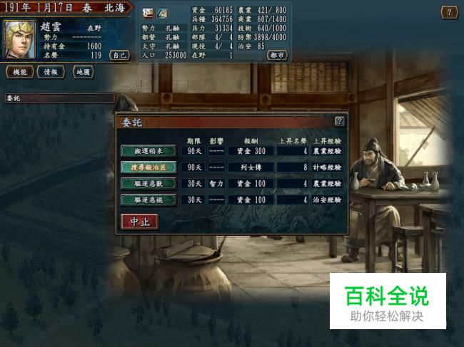 第一种就是通过任务获得。在三国志10的游戏里,每一座城市都有很多设施,市场啊,農地啊,工房啊,驻所啊等等,其中有一个地方叫做酒家,在酒家里会有各种各样的委托任务,有时候会遇到任务奖励是宝物的任务。