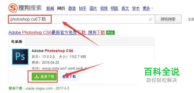 打开搜狗搜索,在输入框内输入photoshop下载关键词,点击搜索找到photoshop 软件,并找到高速下载选项,这里以CS6版本为例,过程都是一样的,如图所示: