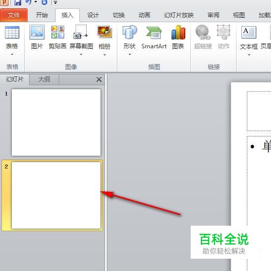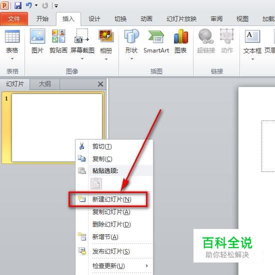 如图,打开PPT之后,在右边的原有的幻灯片上单击鼠标右键,选择“新建幻灯片”。