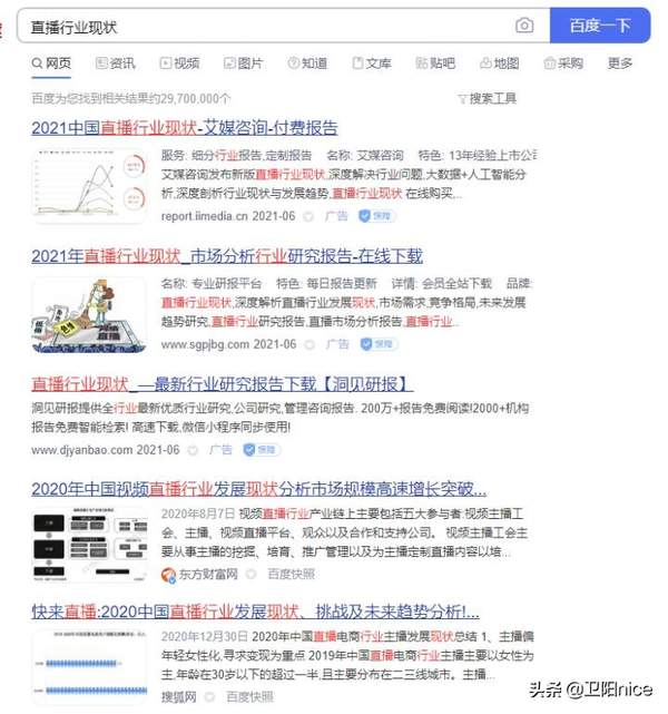 所以了解行业现状,听听前辈们是怎么说的,能很好的给你满脑子冲动降降温。如何了解行业现状呢?很简单,直接百度关键词“直播行业现状”,你可以看到很多有用的信息,了解行业最新现状。