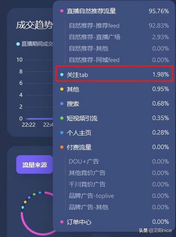 给大家看一个例子,下图是抖音直播间的流量构成,包括自然推荐流量、关注tab、付费流量以及其他流量。可以看到,这个直播间的“关注tab”流量只占了1.98%,也就是说,如果这个账号有100万粉丝,那么这100万粉丝中,只有不到2万人看了他的直播。