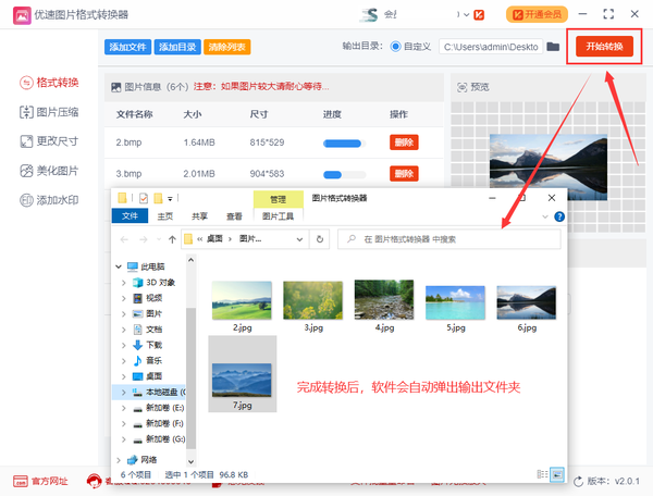 步骤3,先选择输出目录文件夹,用来保存转换后的图片;之后就可以点击右上角红色按钮启动格式转换了,完成转换后软件会自动弹出输出文件夹,方便我们及时查看转成的jpg图片。