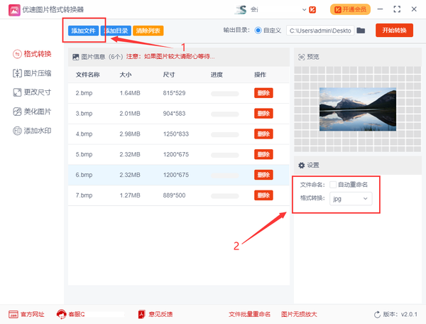 步骤2,点击【添加文件】蓝色按键,将需要格式转换的bmp图片导入到软件中,可以批量添加和批量转换;然后在右边设置转换后的格式,在下拉框中选择“jpg”。