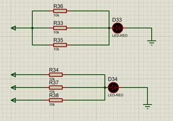 经过测量,1、2、3脚为接地,并且互相短接,4脚为检测脚(可能是检测电源功率)5、6、7脚为供电,互相短接。通过脑补了一下并且做了个类似的仿真画到了Proteus里。