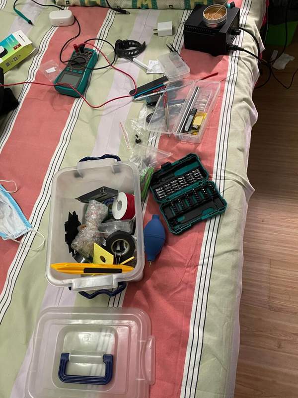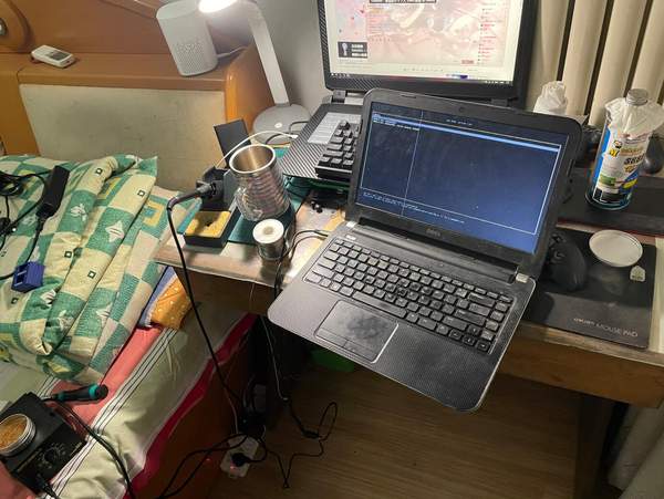 既然配件都全了那么就开始焊接,我的思路是把原装的电源接口延长线从接头上焊下来然后替换成我的诱骗模块(测试的时候忘拍照了,电流和电压都OK),这样底座就可以不用焊接了(主板原装的高温锡太强了,450°C都不化)。