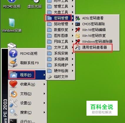 成功登录到大白菜pe系统桌面,点击开始菜单,依次选择“程序-密码管理-通用密码查看器”。