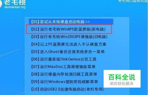 回车后,我们可以看到电脑进入老毛桃主菜单界面,用键盘上“↑↓”方向键将光标移至“[2]运行老毛桃Win8PE防蓝屏版(新电脑)”,回车进入PE系统,如图所示: