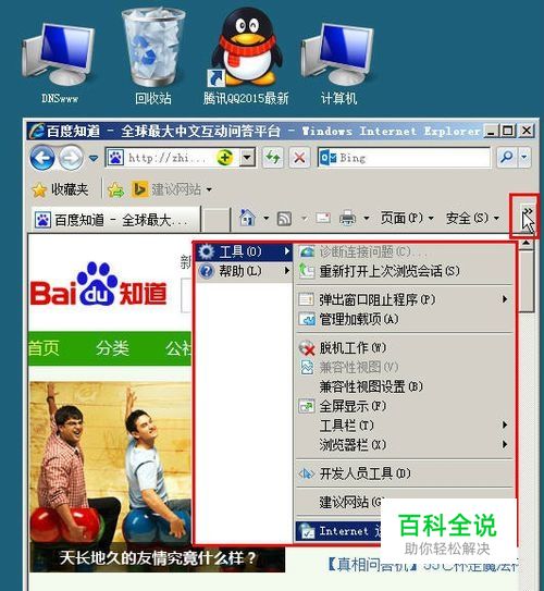 2-在Internet Explorer浏览器最右边,小箭头,单击它,然后再单击“工具(O) ”,再单击“Internet选项(O)”;