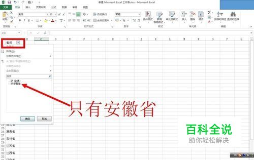 筛选后,我们发现选项只有安徽省,也就是说,会在第一个空白的单元格处断开,如下图所示:
