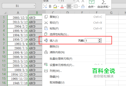 如图片,右键单击B列,在弹出的菜单里选择插入