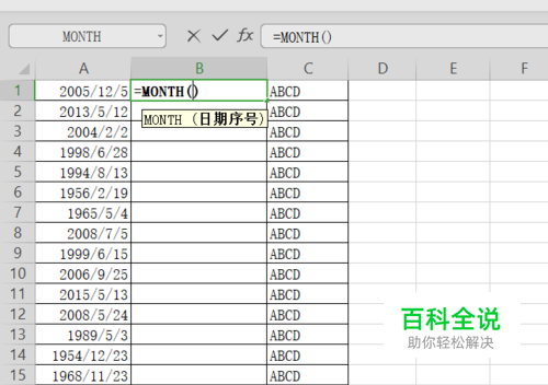 在空白格的第一列输入“=MONTH()”,光标会自动跳进括号中,这时你可以点击左边的日期,括号中会出现日期所在的表格号