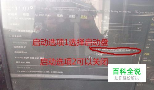然后选择到“启动”选项如图,用鼠标滑轮向下滑,或者用下箭头向下移动,选择到“安全启动”栏里,把启动选项1设置为启动盘,把启动选项2设置为关闭即可如图